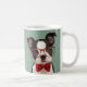 Cute illustration of a hipster style boston terrier puppy wearing eye glasses and chic red bow tie on blue background. Designed by Maryline Cazenave.