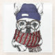 This portrait of a cozy winter dog features French Bulldog wearing knitted scarf, beanie and eyeglasses