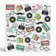 A binder featuring a hipster themed design consisting of illustrations of bicycles, glasses, cassette tapes, vinyl records, skeleton keys, mustaches, cameras, and retro antenna television sets.