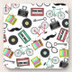 Cork coasters featuring a hipster themed design consisting of illustrations of bicycles, glasses, cassette tapes, vinyl records, skeleton keys, mustaches, cameras, and retro antenna television sets.