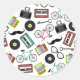 A sticker featuring a hipster themed design consisting of illustrations of bicycles, glasses, cassette tapes, vinyl records, skeleton keys, mustaches, cameras, and retro antenna television sets.