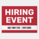 Hiring Event sign in eye-catching white on red design with your custom text or information added below. Sign prints the same on both sides.