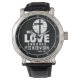 An impactful art piece featuring the words HIS LOVE ENDURES FOREVER in white lettering on a black background, accompanied by a cross and Psalm 136:1. The design includes a bold white cross within a circular emblem, emphasizing the spiritual message. A powerful item perfect for expressing faith and devotion.