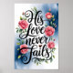 "Celebrate God’s unwavering love with this elegant watercolor typography featuring the phrase 'His Love Never Fails,' adorned with vibrant roses and flowing script."