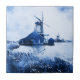 Tile featuring a stylized watercolor painting of Dutch mills in Delft blue.