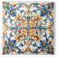 This captivating tile showcases an intricate design, featuring a burst of blue, orange, and yellow flowers intertwined with lush green foliage.