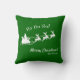 Add a fun seasonal touch to your home with this custom green and white throw pillow. Throw pillow features green background with white Merry Christmas greeting and Ho Ho Ho text, your family last name, and Santa Claus flying in his sleigh with reindeer.