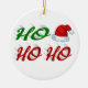 Christmas tree ornament with ho ho ho in 3D green and red letters and a Santa Claus hat.