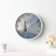 This wood framed clock is decorated with the Hoad Monument, more properly called The Sir John Barrow Monument, which stands at the top of Hoad Hill above Ulverston, South Lakeland, Cumbria, UK. It takes the form of a lighthouse, though has never been used as one. This is a digitally enhanced photo manipulation of the monument in snow, with the light of the sun low in the sky behind the monument. The mood is gentle and contemplative, the colour palette is of grays and white. The clock has black numbers and here is shown in a white wood frame.