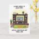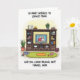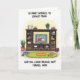 Designed with a cozy living-room scene, this card centers on a sturdy wooden media console set against a warm yellow wall, giving the space a gentle, lived-in glow. On the shelves sit a sewing machine, a bowl of fruit, a leafy potted plant, craft tools, stacked books, and a couple of vases, like quiet clues to a life full of interests. A television on top shows two friendly, smiling adults leaning close with an affectionate ease, adding a soft, loving tone ❤️. On the green rug below, the tidy order gives way to a small mess—tangled yarn, an open activity book, a few apples, and a little backpack—hinting at caregiving woven into everyday routines 🌼. The main message is printed in all caps across the top and bottom edges, easy to read and set in a dark color against the light background. The top line reads, “SO MANY HOBBIES TO CHOOSE FROM.” and the lower lines continue, “AND YOU CHOSE RAISING ME?? THANKS, MOM.” The console is medium brown with simple legs, and the rug is a muted green with the scattered items clustered near the center.