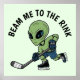 Bring some intergalactic flair to your decor with our poster featuring an alien bending over to hit a puck with an ice hockey stick. The design captures the spirit of the game while adding a touch of cosmic charm. Above the alien, the phrase "Beam Me to the Rink" playfully invites you to join the fun. Perfect for hockey enthusiasts and sci-fi lovers alike.