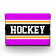 This sporty, athletic design features bold HOCKEY text inside a highlighted wide center black stripe with white and yellow orange racing stripes against bright pink outer stripes. The text can be personalized.