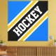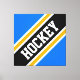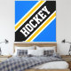 This sporty bold design features athletic HOCKEY text inside a highlighted wide diagonal black, white, and golden yellow orange racing stripes against bright blue outer stripes. The text in this design can be personalized.