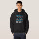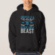 Hockey Goalie hoodie with blue and white text, helmet with mask, pucks, and hockey sticks reads Drop Like a Butterfly Block Like a Beast!
