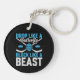 Hockey Goalie keychain with blue and white text, helmet with mask, pucks, and hockey sticks reads Drop Like a Butterfly Block Like a Beast!