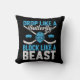 Hockey Goalie throw pillow with blue and white text, helmet with mask, pucks, and hockey sticks reads Drop Like a Butterfly Block Like a Beast!
