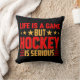Life is a Game But Hockey Is Serious red and gold text hockey throw pillow.