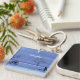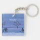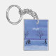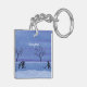 A watercolor painting of kids playing ice hockey on a frozen pond adorns this customizable keychain!
