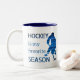 Left Design: "Hockey is my favorite season" + player silhouette in shades of blue -