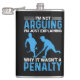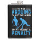 Hockey Player Penalty flask with white and blue text on a black background reads I'm Not Arguing I'm Just Explaining Why It Wasn't a Penalty! Hockey humor flask, sure to be a hit with any hockey player also features blue silhouette hockey players.
