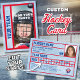 Be just like the pros by having your very own custom hockey card featuring a photo of yourself on the front and your personal hockey statistics on the back. You'll get plenty of cards in a pack because these cards are meant to trade with friends and also to give to relatives. Put your little league player on a card today! Both the front and back of the hockey card have a skate-marked ice surface as a background with red line borders.