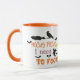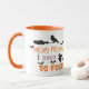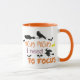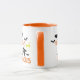 funny Costum coffe mug for Halloween features a modern decorative orange and black typography design with flying witch and bats arround.
