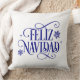 This Christmas throw pillow is shown with festive holiday Feliz Navidad snowflakes print.
