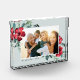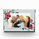 Elegant holiday keepsake photo block features your favorite photo flanked by vibrant red watercolor flowers and lush greenery on a wintry pale sage background. Your names and/or custom message appear in elegant lettering beneath.