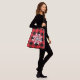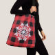 This cross-body tote bag is shown with a black and red buffalo plaid with a large snowflake print design.