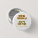 Fun festive button with "Merry Christmas and a Happy New Year "on it and space for your name or company. Lettering in a cheery red and green geometric pattern outlined in gold. Great for work or holiday parties when getting together with family, friends or co-workers.