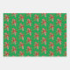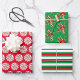 Holiday candy and colors are featured in this trio of wrapping paper sheets. A red background with a pattern of red and white peppermint candy. The next design has a green background with a pattern of Candy Canes and the third sheet is made up of whit, green and red stripes.