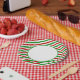 Party paper plate is shown with a festive holiday candy cane striped print.