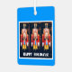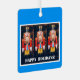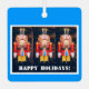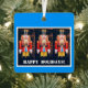 Christmas Holiday Ornament features photo of traditional nutcracker figure and the words, "Happy Holidays". Text is customizable. Square metal with red ribbon hanger.