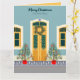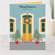 This festive and elegant Christmas illustration showcases the blue façade of an old traditional Portuguese house adorned with yellow wooden doors and windows and wrought iron balconies. Portuguese pavement graces the sidewalk, while two Christmas trees adorned with colorful Christmas balls stand by the entrance. A Christmas wreath graces the door.