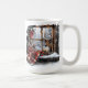 This ceramic coffee mug is shown in a lovely festive holiday vintage winter scene art print.