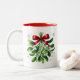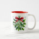 This ceramic coffee mug is shown in a festive holiday mistletoe print.