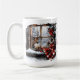 This ceramic coffee mug is shown in a lovely festive holiday vintage winter scene art print.
