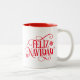 This ceramic coffee mug is shown in a festive holiday Feliz Navidad snowflakes print.