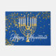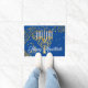Blue with White text "Happy Hanukkah" in a fancy script with two Gold looking swirls of stars on each end.