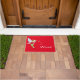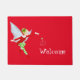 Holiday doormat shown with a red background with a cute magical fairy welcome print.