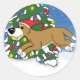 This adorable brown & white cartoon dog is doing a huge leap over a Christmas tree branch. He's wearing a red Santa cap and carrying a round yellow ornament in his mouth. The background is blue with falling snow. Unique Christmas flyball gift for pet owners. At the bottom it reads, "Dashing through the snow..."