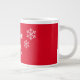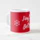 This jumbo size coffee mug is shown with a cute holiday message of Jingle Bells print with snowflakes.
