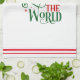 Holiday kitchen towel is shown in a festive Joy to the world print design.