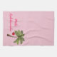 Kitchen towel shown in a festive holiday palm tree print. Mele Kalikimaka is Merry Christmas in Hawaiian in bright pink text, towel is Pinot Noir Pink.