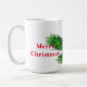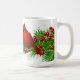 This ceramic coffee mug is shown in a festive Christmas holiday red cardinal bird print design.