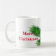 This ceramic coffee mug is shown in a festive Christmas holiday red cardinal bird print design.