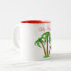 This coffee mug is shown with this cute green palm trees with a single ornament print. Greeting says "Feliz Navidad"