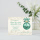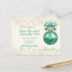 Holiday office party invitation postcard with template text. Green and gold colors with a big teal green ornament on the front and snowflakes front and back. Add all party info to the front and address using the lines on reverse.