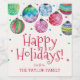 This holiday ornament christmas wine label makes the perfect festive holiday gift. The watercolor design features dangling colorful christmas baubles with red green and blue confetti. Personalize the label with your name.