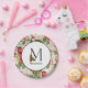 The Letter M... a monogram trimmed with holly and ribbon, tied into a bow, offered in traditional yule colors...is the centerpiece of this beautiful Christmas plate. The outer edge is designed with a holiday floral mix, including holly sprigs, pink and white flowers, pretty birds and other holiday greenery. This plate will be an elegant addition to your holiday table! Personalize with your family name.